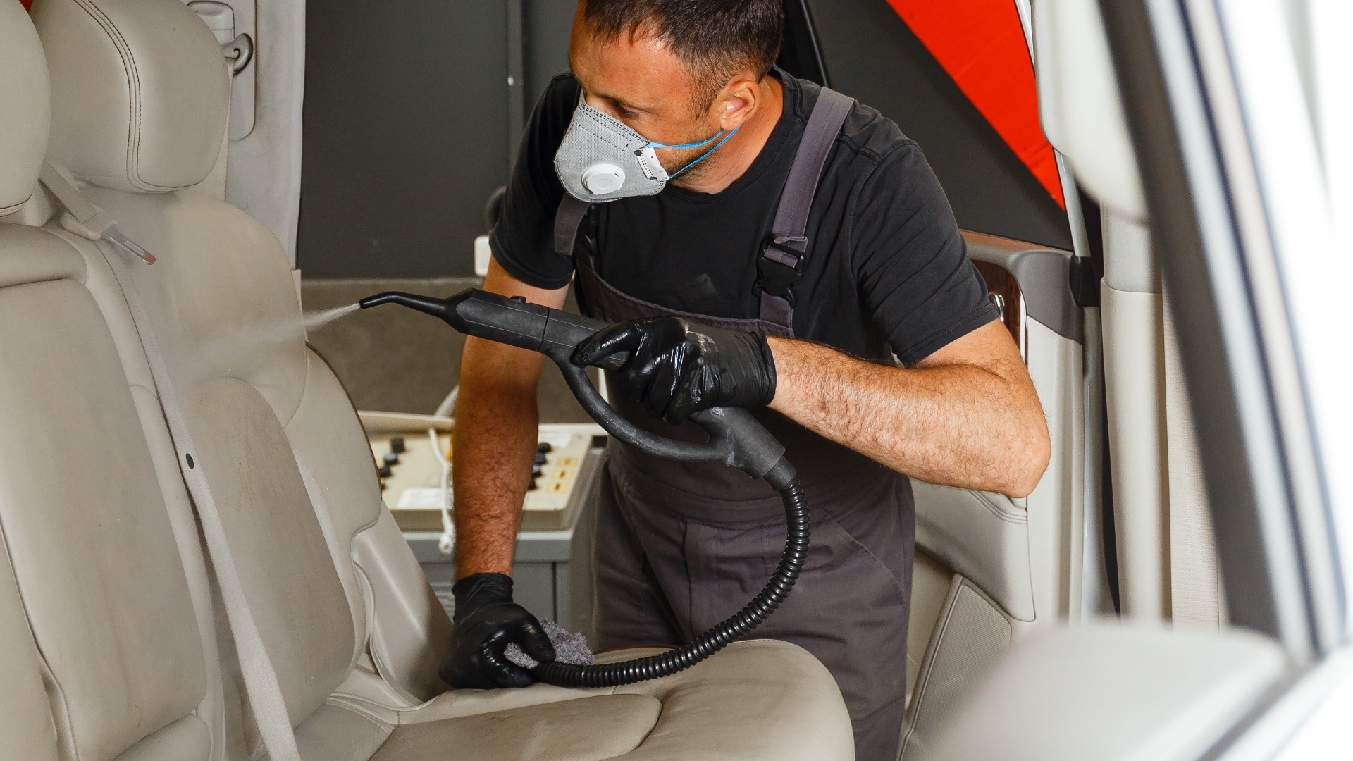 - Определяем тип материала обивки (ткань, алькантара, натуральная кожа, экокожа) и подбираем специальные, безопасные для него составы.