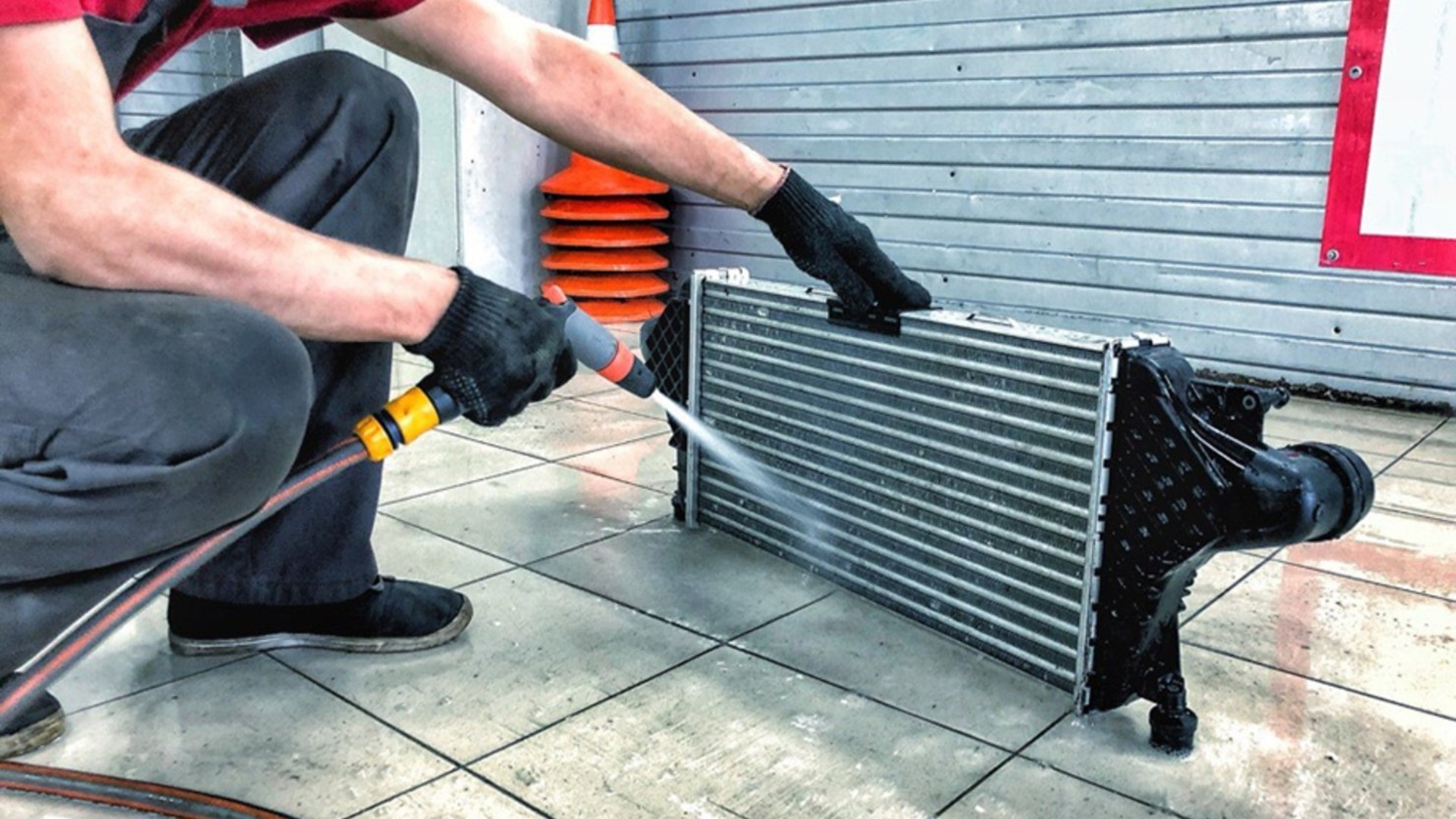 • Нанесение специальной активной пены для радиаторов, которая растворяет органические загрязнения (насекомых, биопленку).